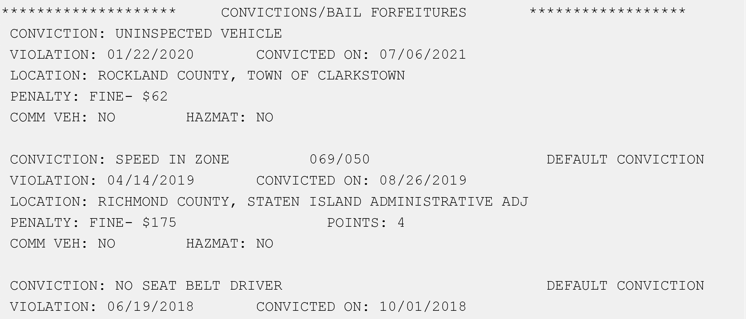 In New York State, points appear on your driving record on the day of conviction. In New York, there are different types of driving records. There is a lifetime record and a standard driving record. Once a violation goes onto your lifetime driving record it never comes off unless the conviction is vacated (appealed). There is also a standard driving record. Your violation will come off your standard driving record on January 1 following three years from the date of conviction. For example, if you are convicted in March of 2025, the violation will appear on your record in March of 2026 (year 1), March of 2027 (year 2), March of 2028 (year 3), and will continue appearing on your record through December of 2028. It will no longer appear on your record in January of 2029. This timeline roughly correlates with insurance calculations. Your insurance company can raise your rates for 3-4 years after a conviction.