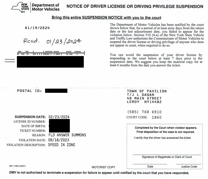 This is the title of a Notice you may have received from the New York State Department of Motor Vehicles (DMV). This means a court in New York State has determined that you either failed to answer a ticket or failed to appear in court for a court date. If you receive this notice, you should take care of it as soon as possible.