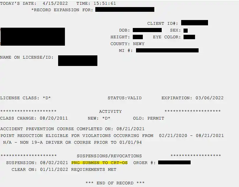 If you are reading this page, you are likely a New York State motorist that is suspended. The reason for the suspension is listed on your abstract as “PNG SUBMSN TO CRT-OS”. This is short for “Pending Submission to Court Out of State.” It means you got a ticket in another state and failed to answer the ticket with a Guilty plea or Not Guilty plea. In all likelihood, you got the out-of-state ticket many months ago, and perhaps years ago. The actual process that gets you suspended in New York State goes through several steps. The out-of-state court that has jurisdiction over the ticket reports the failure to answer to their Department of Motor Vehicles (DMV). The out-of-state DMV then reports the failure to answer to the New York State DMV, which then suspends your license.